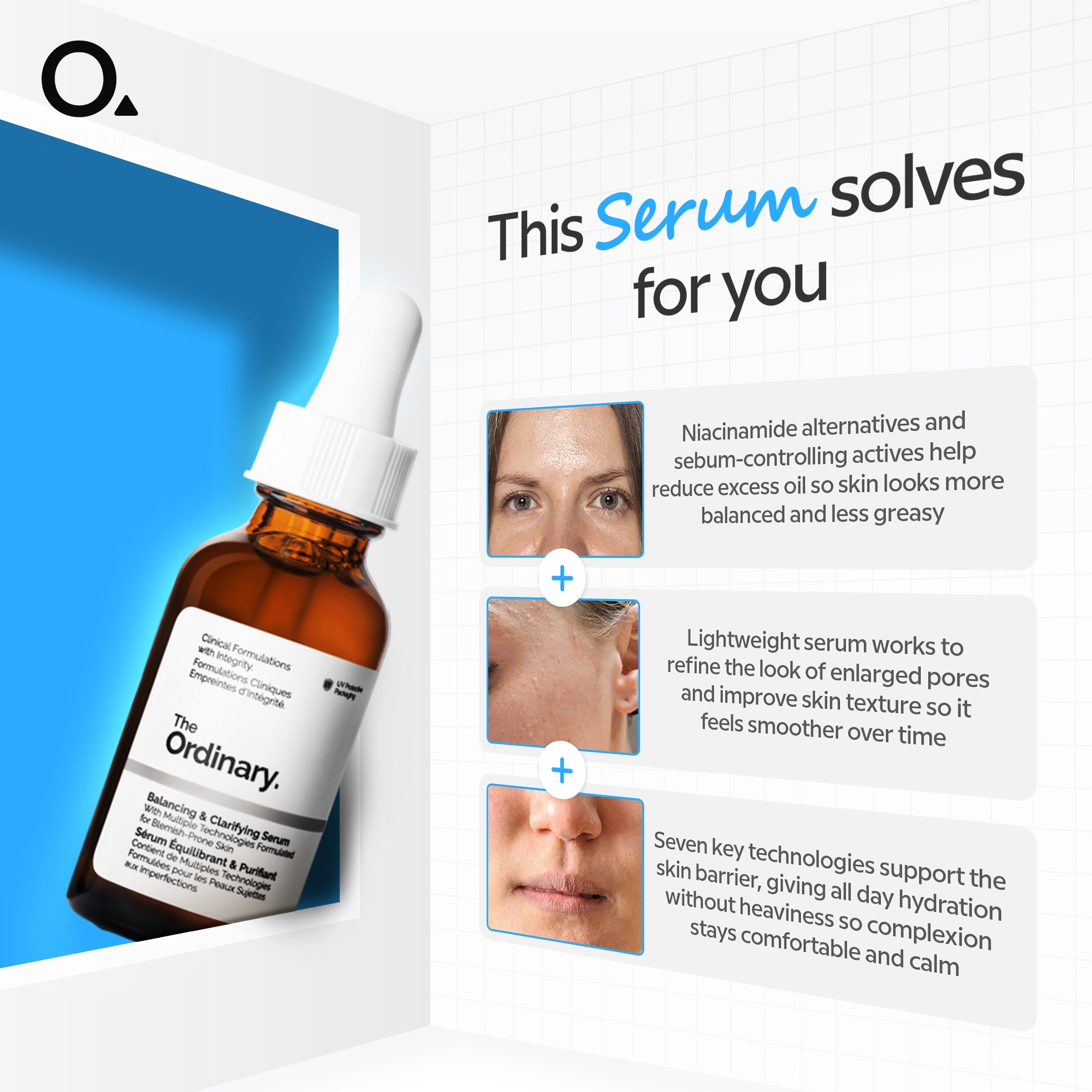 The Ordinary Balancing & Clarifying Serum is a multi-active solution formulated to target oily, blemish-prone, and congested skin. This lightweight serum helps visibly minimize enlarged pores, reduce excess oil, and smooth uneven skin texture. Powered by a blend of seven key technologies, it restores balance to the skin barrier while keeping hydration levels intact. With ingredients like niacinamide alternatives, peptides, amino sugars, and probiotics, it works gently yet effectively to refine and clarify. Sarcosine, L-Carnitine, and Polylysine help control shine, while Adenosine and N-Acetylglucosamine improve skin texture and promote radiance. Ectoin and Lactococcus Ferment Lysate strengthen and protect the skin barrier against environmental stress. Suitable for all skin types, this serum is especially beneficial for oily and combination skin, leaving the complexion visibly clearer, balanced, and healthy-looking.