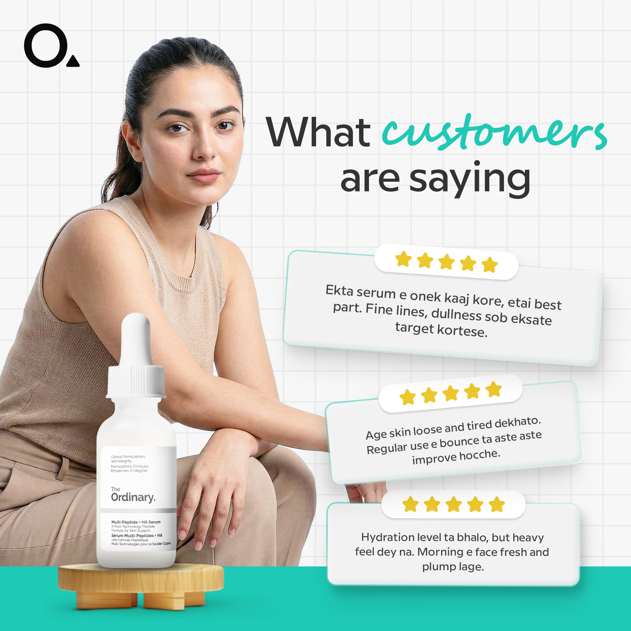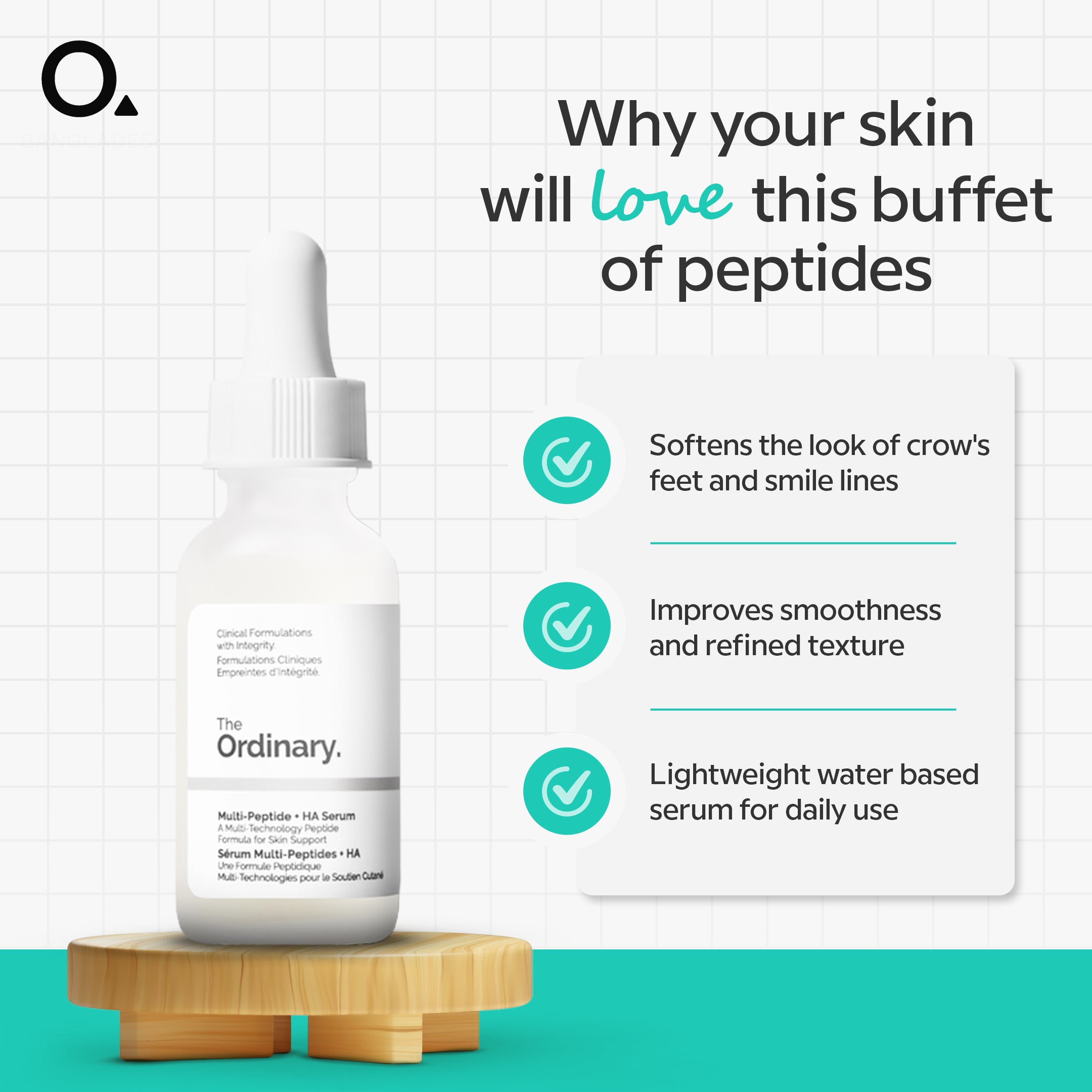 Multi-Peptide + HA Serum (formerly known as “Buffet”) is a universal formula that combines a comprehensive array of technologies to improve skin smoothness and target multiple signs of aging at once. By utilizing four well-studied peptide technologies, skin-friendly amino acids, and multiple hyaluronic acid complexes, it helps significantly improve the appearance of crow’s feet, as well as improving the feel of skin elasticity and firmness.